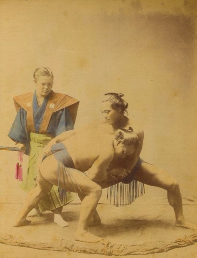 ▲ 1897年頃の力士というと、どんな人がいたのかわからないですが、相撲は当時も人気があったと思います。右側の力士がヨン様系のイケメン。