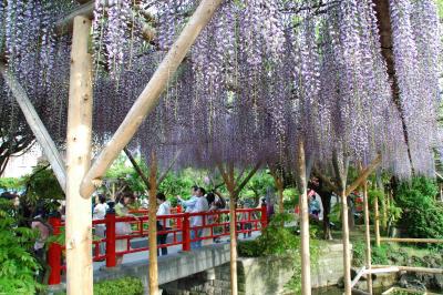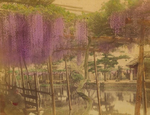 ▲ 「藤のまつりが行われている亀戸天神」と題されています。亀戸にこんなキレイなところがあるのかと思って、調べてみますと、今も藤祭りは行われているようです。下の写真がそうです。
