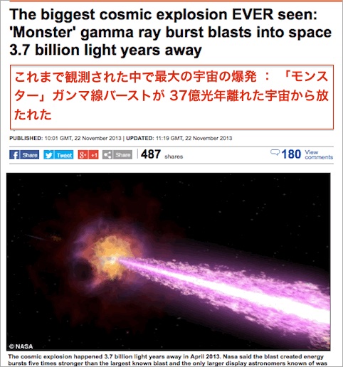 というわけで、観測史上最大のガンマ線バーストの記事をデイリーメールよりご紹介いたします。