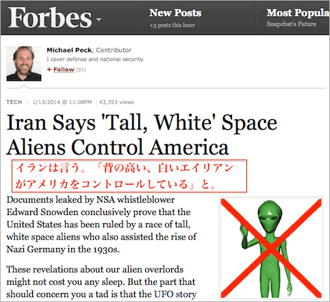しかし、「エイリアン」という概念についてはともかくとしても、イランの報道の記事の中にある