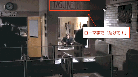 その内容そのものは記事を読んでいただければ幸いですが、映画のシーンの中の言語研究所のセットの中に、下のように「 TASUKETE (たすけて)」と書かれた看板か横断幕のようなものがあることに気づきました。