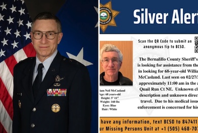 元米空軍研究所の司令官で、ニューメキシコ州カートランド空軍基地の元研究司令官であるウィリアム・ニール・マッカースランド氏は、2026年2月27日にニューメキシコ州アルバカーキの自宅から姿を消した。68歳の彼が行方不明になった後、「シルバーアラート」(アメリカで認知症などの高齢者が行方不明になった際の緊急通知システム)が発令された。