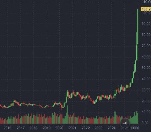 2026年1月現在、銀価格は、90〜100ドル前後で推移し(一時$100突破の記録あり)、2025年の260%超の上昇からさらに加速しています。