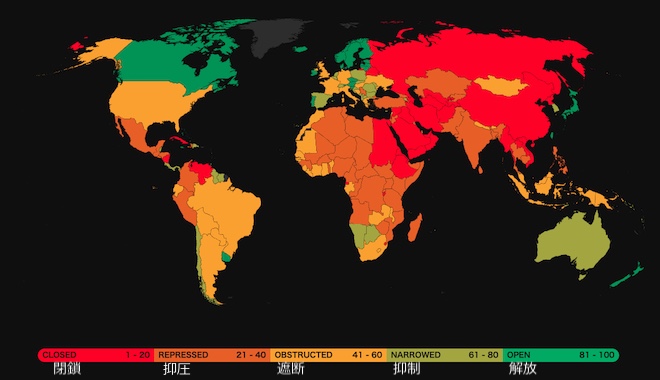 毎年、「自由度ランキング」というようなものが発表されていて、こういうのはいろいろな組織が発行しているものでもありますけれど、そのひとつである「攻撃を受ける人民の力」報告書 (People Power Under Attack report)という物々しい名称の自由度ランキングがありまして、それを見ますと、どういう評価なのかは詳細は不明にしても、マップには以下のように記されています。