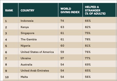 一方で、「世界で最も見知らぬ人々を助ける国のランキング」というのもあります。