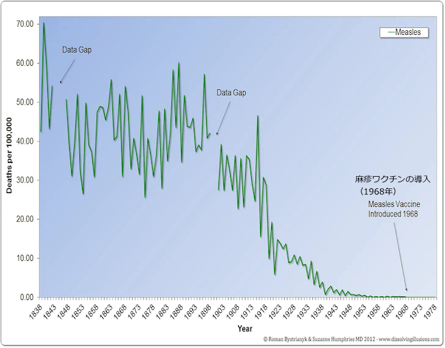 現在、麻疹のワクチンが存在することから、ワクチン接種が麻疹の劇的な減少の鍵となったと一般的に考えられている。しかし、イングランドとウェールズのデータは、1968年に全国的な麻疹予防接種プログラムが導入される以前から、麻疹による死亡率がすでにほぼ 100%減少していたことを明確に示している。