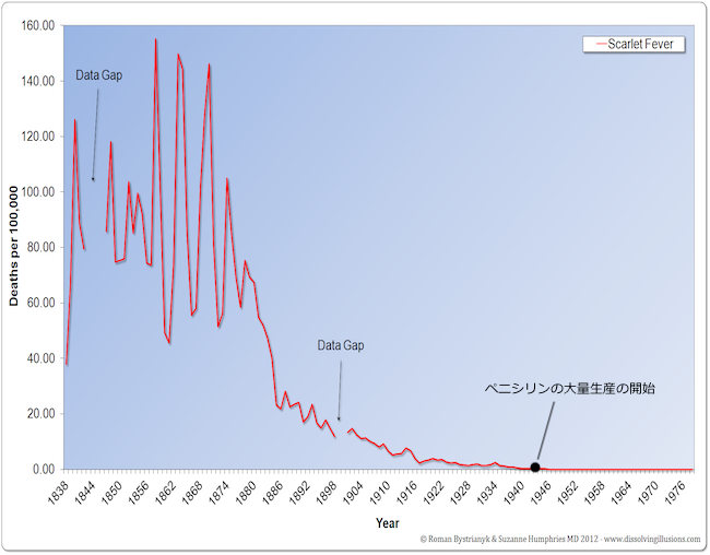 重要なのは、猩紅熱に対しては広く普及するワクチンが開発されなかったことだ。ペニシリンなどの抗生物質(1944年に初めて大量生産された)は最終的にこの病気の治療に使用されたが、死亡率の最も急激かつ持続的な低下は、それより数十年前、医療介入が行われるずっと以前に起こった。