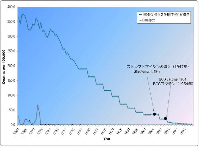 医学史家トマス・マキューンが指摘したように、これらの医療介入が導入される以前から、結核による死亡率はすでに 96.8%という驚異的な減少を遂げていた。