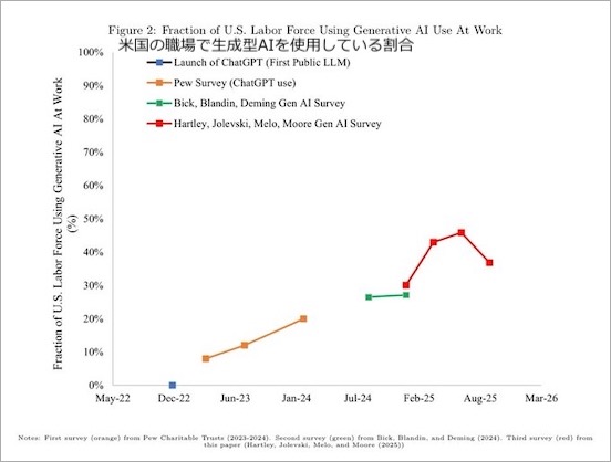 フィンテック企業 Ramp による別の推計によると、アメリカ企業における AI の利用率は 2025年初頭に約 40%まで急増したが、その後は横ばい状態にあるという。