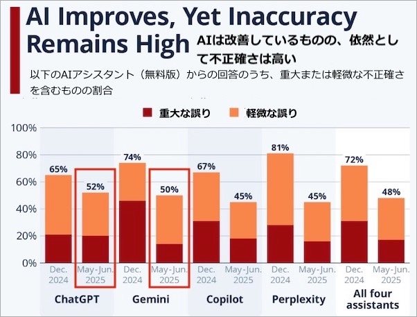 ChatGPT で誤った回答が返ってきた率が 52%、Google の Gemini で 50%でした。およそ半分の回答が不正確あるいは完全に間違っていることになります。