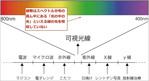 下の図は色の分布で、図の下に「電波」とか「マイクロ波」とかが書かれてありますが、つまり、私たちは電波とかマイクロ波とかいう「波長に色を感じている」わけです。波長に色などはついているわけもないのに、私たちはそれを「色」と認識します。