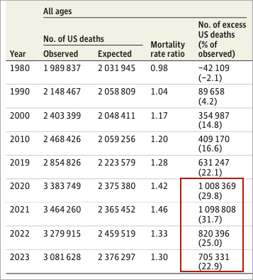 1980年から 2023年の間に、米国では推定 1,470万人の超過死亡が発生した。2023年には、超過死亡は米国の全死亡数の約 23%を占めることになる。