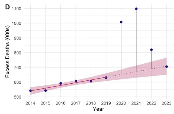 その論文によりますと、2023年の時点でも、まだパンデミック前の 2019年の超過死亡率より高い水準のままであることが示されていました。