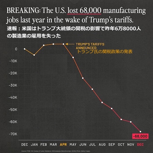 トランプ氏が関税政策を発表してからのアメリカの製造業の雇用の急落がものすごいことに
