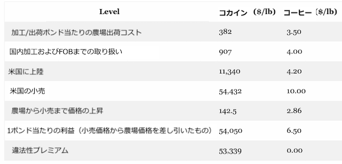 コカインのコロンビアの農場出荷価格から小売価格までのマークアップ(小売り上昇分)は、小売流通される製品 1ポンドあたり 142.5倍、つまり 54,050ドル (約 850万円)だ。