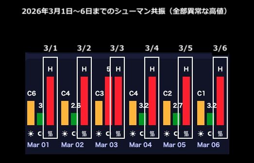 ちなみに、全然関係のない話ですが、シューマン共振が 3月に入ってから、6日間連続で乱れっぱなしでした(周波数が異常に高い)。